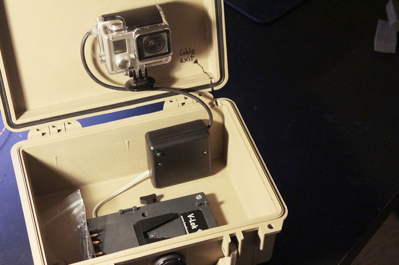 The GoPro is powered by a V-lok battery, through a voltage regulator into a GoPro dummy battery.