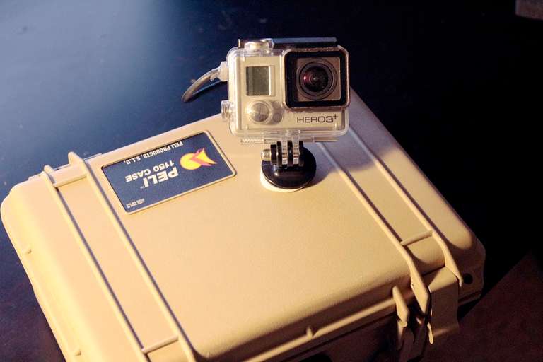Every 30 minutes a microcontroller triggers the GoPro on and a custom script on the MicroSD card triggers the GoPro to take a photo and power down.